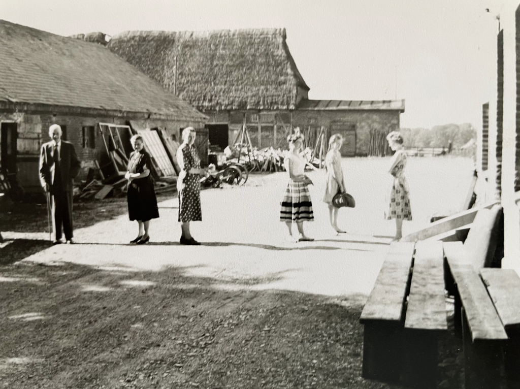 Besuch der Familie im neuen Haus mit alten Stallgebäuden im Hintergrund, März 1959, (c) unbekannt